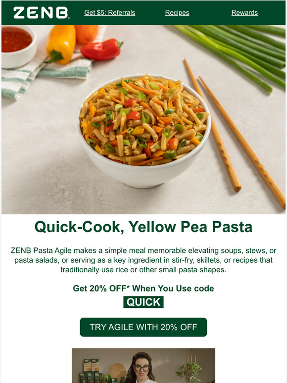 I saw an advert for zenb on tv. ZENB Pasta Has More Protein More Fiber And Less Net Carbs Than Traditional Pasta. Made from 100 yellow peas ZENB Pasta is an exciting new twist on a much-loved kitchen staple.